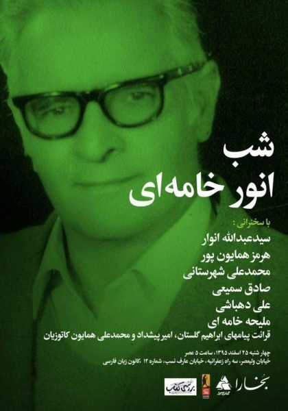 یک صدسالگی دکتر انور خامهای از فعالان سیاسی تاریخ معاصر ایران و فرزند یحیی کاشانی مجتهد آزادیخواه و از مبارزان خط اول نهضت مشروطه با حضور سیدعبدالله انوار، هرمز همایون پور، محمدعلی شهرستانی، صادق سمیعی، علی دهباشی، ملیحه خامه ای و قرائت پیامهای ابراهیم گلستان، امیر پیشداد و محدعلی همایون کاتوزیان، روز چهارشنبه ۲۵ اسفند در کانون زبان فارسی پاس داشته شد.