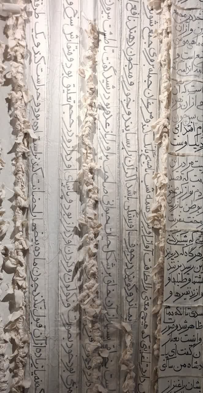در بعضی از کارهای همتی خط نوشتههایی از کتاب عجایب المخلوقات کنار گره در گرههای پارچه و طنابها نقش یا رقم خورده که انهم بیننده را به ژرفای این نمایشگاه متوجه میکند.