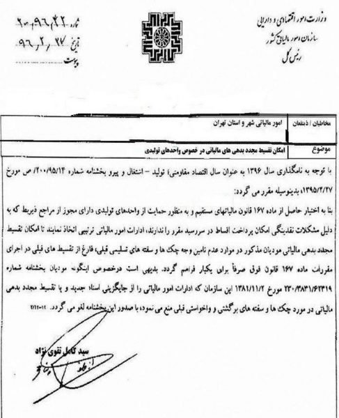بنابر اختیار حاصل از ماده ۱۶۷ قانون مالیاتهای مستقیم و بهمنظور حمایت از واحدهای تولیدی دارای مجوز از مراجع ذیربط که به دلیل مشکل نقدینگی امکان پرداخت اقساط سررسید مقرر را ندارند، ادارات امور مالیاتی ترتیبی اتخاذ کنند تا امکان تقسیط مجدد بدهی مالیات مؤدیان مذکور در موارد عدم تأمین وجه چکها و سفتههای تسلیمی قبلی، فارغ از تقسیطهای قبلی در اجرای مقررات ماده ۱۶۷ قانون فوق صرفاً برای یکبار فراهم شود.بدیهی است در خصوص اینگونه مؤدیان بخشنامه شماره ۶۲۳۱۹/۳۸۳۱/۲۳۰ مورخ ۲/۱۱/گ۱۳۸۱ این سازمان که ادارات امور مالیاتی را از جایگزینی اسناد جدید و با تقسیط مجدد بدهی مالیاتی در مورد چکها و سفتههای برگشتی و واخواستی قبلی منع میکرد، با صدور این بخشنامه لغو میشود.