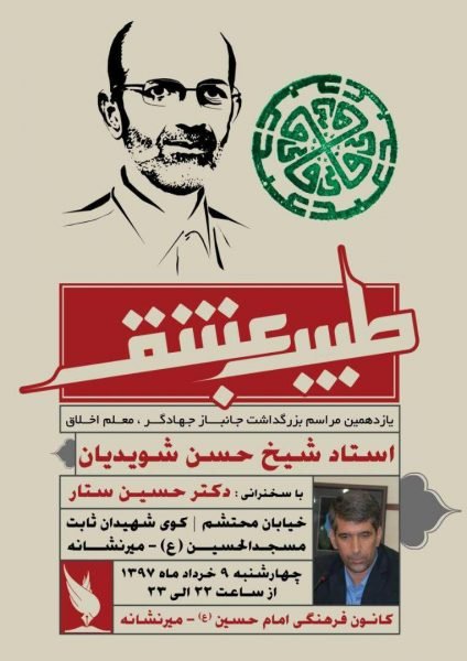 آیین یازدهمین سالگرد درگذشت معلّم دلسوز، جهادگر جانباز و فعّال فرهنگی و اجتماعی، زندهیاد «شیخ حسن شویدیان»، به اهتمام کانون فرهنگی امام حسین (ع) مسجد میرنشانه و خانوادهی آن مرحوم، همزمان با شب میلاد کریم اهلبیت، حضرت امام حسن مجتبی (ع)، در شب نیمهی ماه مبارک رمضان (چهارشنبه ۹ خرداد ۹۷)، از ساعت ۲۲ تا ۲۳ در مسجد میرنشانه، برگزار خواهد شد.