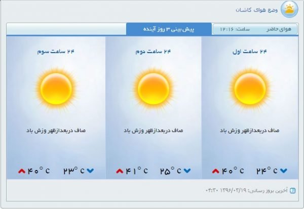 و براساس این پیشبینیها اعلام شده در سایت اداره هواشناسی کاشان امروز هوا صاف و در بعداز ظهر وزش باد خواهیم داشت و دمای هوا بین ۲۴ تا ۴۰ درجه خواهد بود.