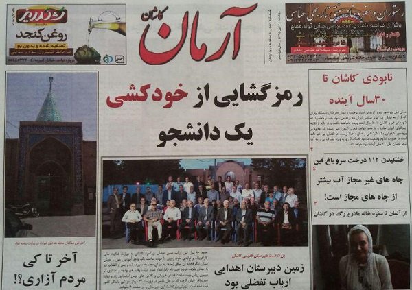 «رمز گشایی از خودکشی یک دانشجو» تیتر اصلی این شماره آرمان کاشان است که اشارهای است به خودکشی «ایوب آقایی» و شرح آن، اطلاعیههای دانشگاه کاشان در این رابطه و اقدامات کارگروه رسیدگی به این پرونده از طرف مجلس، در صفحه ۲ چاپ شده است.