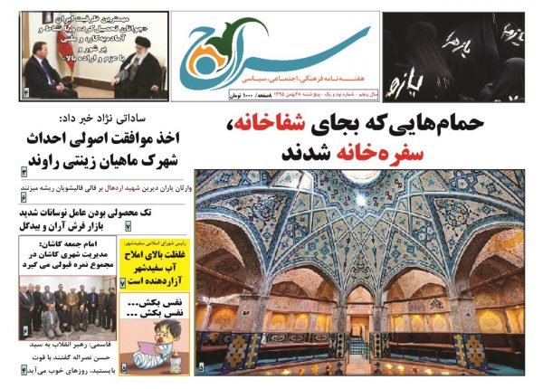 تیتر یک این نشریه “حمام هایی که به جایشفاخانه، سفرهخانه شدند” است که به نقد تغییر کاربری حمامهای عمومی پرداخته است.
