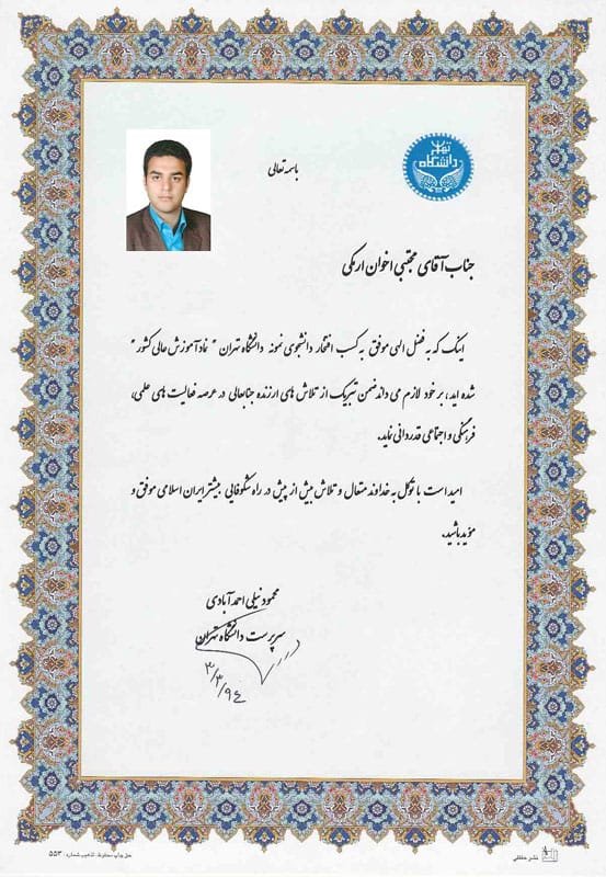 مجتبی اخوان ارمکی دانشجوی دکتری دانشگاه تهران، از بین ۳۲هزار نفر به عنوان دانشجوی نمونه معرفی شد.