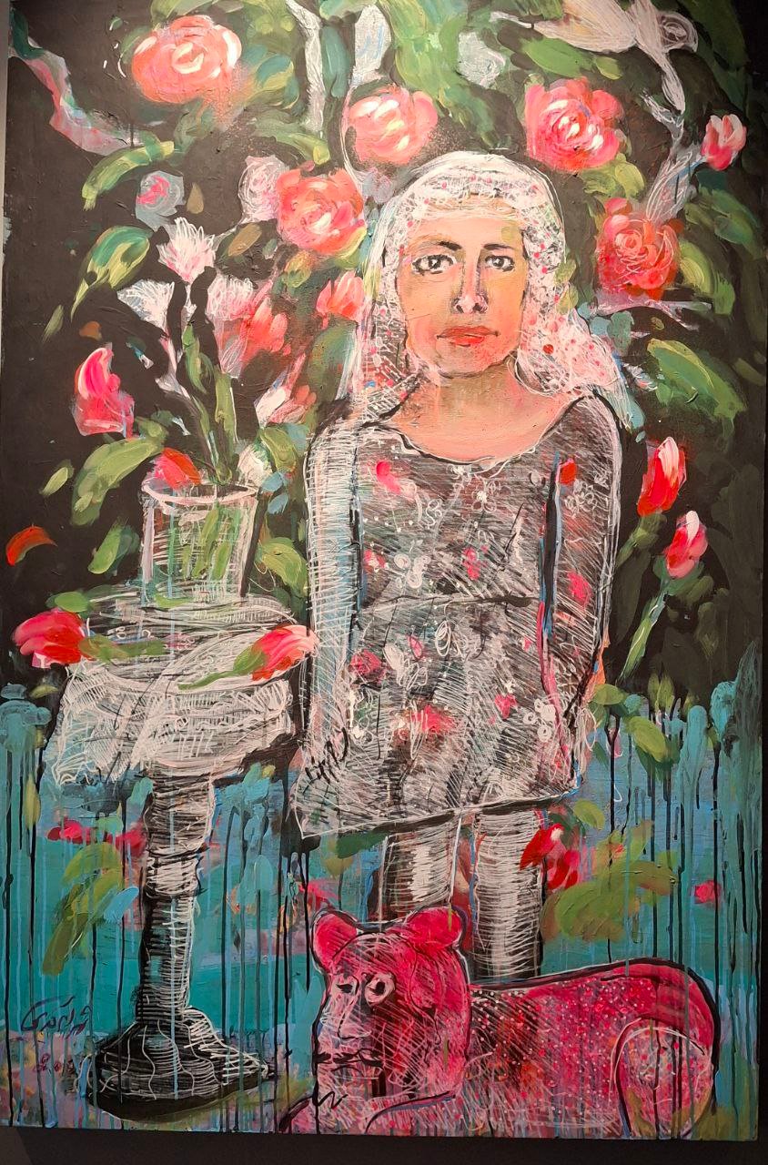 از دیگر نکات بارز نمایشگاه شهرام کریمی نقش گلهایی است که در اکثر تابلوها وجود دارد. حتا گاهی حس میشود این گلها خودشان را به تابلو تحمیل کرده و امکانی برای حذف و ندیده گرفتنشان نیست. این نقشها یا از زمینه اصلی بومهاست که بر آنها حک شده یا با تاشهای رنگ بر بستر تابلو بر روی پیراهن شخصیتها و جای جای دیگر نشسته یا با خراش حکایت از دیرینگی و نقش موثر در زندگی دارند، میشود مبین نشانههایی دانست که برای فهم و حل آن نیاز به تامل در نشانههای مرتبط است. که هنر اگر تفسیر به یک حلقه محدود شود این حیطه دورانی ناخودآگاه مرتبط و ارجاع پذیر به تمام نشانهها دیگر است.