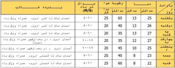 حداکثر و حداقل دما در طول هفته گذشته به ترتیب؛ ۳۲ و ۶/۱۰ سانتی گراد گزارش شده است.